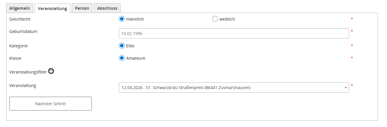 selbst ausgewählt. Bei „Veranstaltung“ den Schwarzbräu Straßenpreis auswählen.
