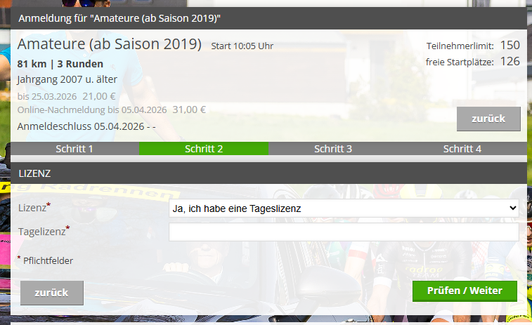 Du möchtest beim Schwarzbräupreis starten, aber die Startplätze in der Jedermannklasse sind bereits alle weg? Dann besteht die Möglichkeit auch per Tageslizenz in der Amateurklasse bzw. der jeweiligen Altersklasse teilzunehmen.